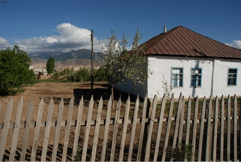 Bokonbaevo is a ghost of a town. It is a wide, vast, quadratic series of dusty streets, about 5 km south of the blue shores of Lake Issyk Kul. It is a dot on the cracked and pot-holed highway leading around the lake and onward to Bishkek. Here the economic crisis is palpable and real. No factories, no industry. No work. The only light in town comes from sunlight bouncing off the new mosque’s metallic cupola and minaret – a gift from Turkey. Contrasting the first dreariness of Bokonbaevo’s sad streets is the abrupt beauty of the Tian Shan, whose peaks rise just beyond the town – but even the mountain’s proud shadows seem to want to hide the degradation of the shamble town. Bokonbaevo seems a scar in the exquisite natural scenery. It is here that Janyl has created her Altyn Oimok (Golden Thimble) – a burst of color and texture.